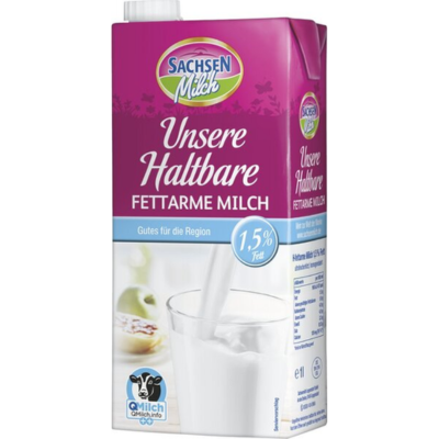 - Fettarme H-Milch mit 1,5 % Fett, ultrahocherhitzt und homogenisiert
